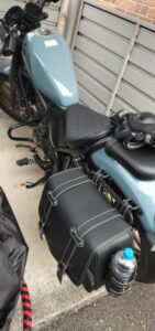 さすがにバッグは自分で付けました。バッグの背中にステーを通してベルトと紐で固定。風でバタつかず、チェーンやタイヤに干渉せず安全に走行出来ます。20リットル大きいかなと心配していましたが跨ぐのには問題ないようです。