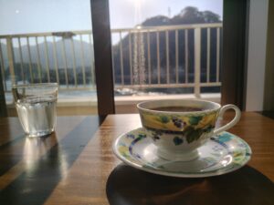 コロンビアをいただきました。…ちょっと眩しかったけど海が見えて好きな席。