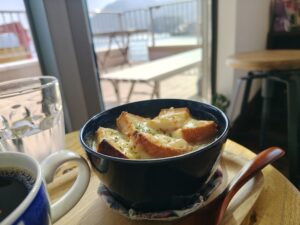 いつもの海沿いを走ってお気に入りのカフェでグラタンスープをいただいたり。