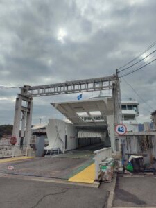 天気予報では晴れだったのですが、曇天です。寒い。その前の週末が暖かかったので落差で震えます。それでも前日に雨が降ったことを考えると今日の方がマシなはず。震えながら乗船を待っている間にバイクは6台くらい増えていました。我々は車が乗り込んだ後の隙間に停める模様。年末に新門司港で乗り込んだフェリーより坂道が急ではないので怖くはありませんでした。緊張はしますが…。